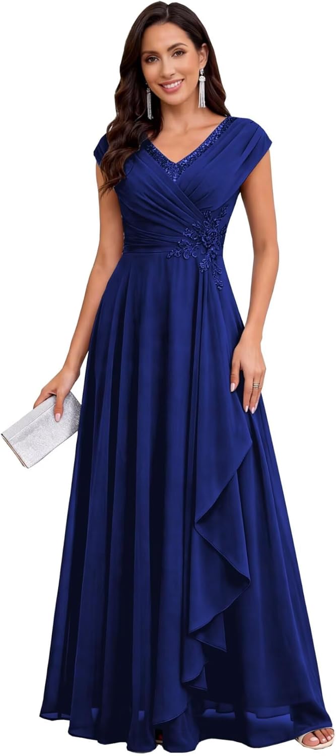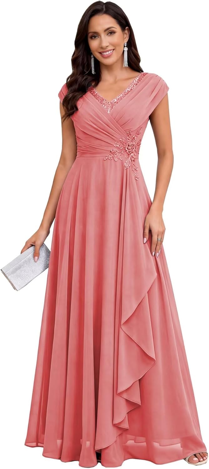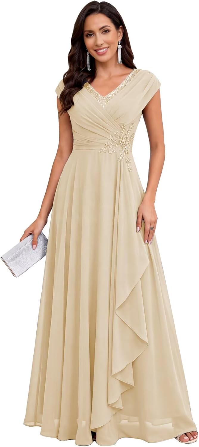 • Feature: Cap Sleeve Chiffon Mother of the Bride Dresses 2026,V Neck,Pleated,Chiffon,Sparkle Sequin,Floral Lace,Floor Length,A Line,Modern Chiffon Outdoor Mother of the Groom Dress,Lace Up Back,Built in Bra.